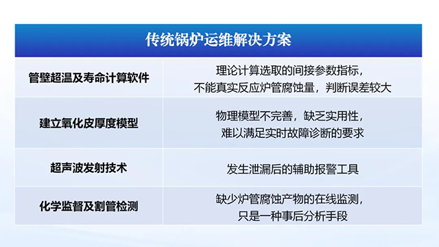 傳統(tǒng)鍋爐運(yùn)維解決方案(如:管壁超溫及壽命計(jì)算軟件、建立氧化皮厚度模型、超聲波發(fā)射技術(shù)、化學(xué)監(jiān)督及割管檢測(cè)等方式)理論計(jì)算選取的間接參數(shù)指標(biāo),不能真實(shí)反應(yīng)爐管腐蝕量,判斷誤差較大;且物理模型不完善,缺乏實(shí)用性,難以滿足實(shí)時(shí)故障診斷的要求;發(fā)生泄漏后的輔助報(bào)警工具;缺少爐管腐蝕產(chǎn)物的在線監(jiān)測(cè),只是一種事后分析手段。